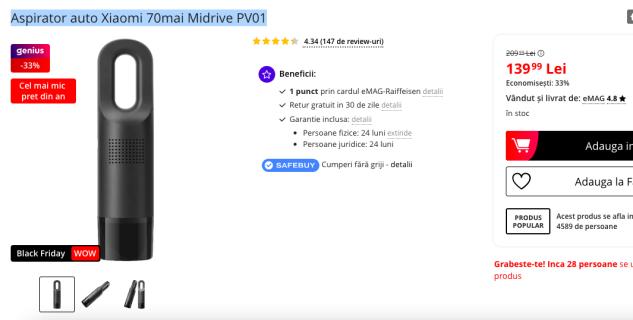 - Aspirator auto Xiaomi 70mai Midrive PV01, design compact și preț atractiv sub 200 lei