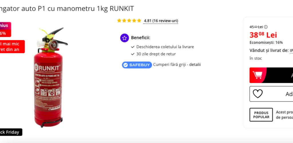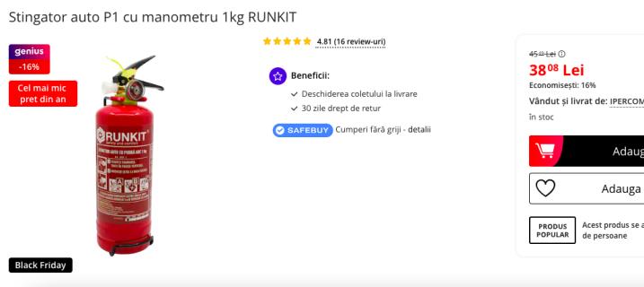 Pretul individual este competitiv comparativ cu costul unui stingător similar din comerțul tradițional, făcându-l o opțiune viabilă pentru înlocuirea echipamentelor expirate.