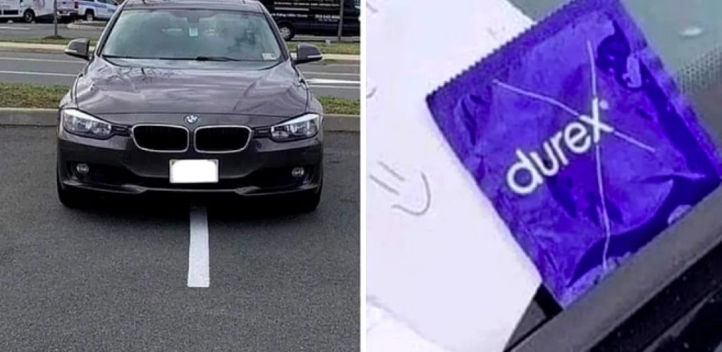 Dar, asta nu e tot! Alături de mesajul sugestiv, persoana care a fost deranjată de modul în care s-a parcat BMW-ul a lăsat și un prezervativ ca simbol al avertismentului său.