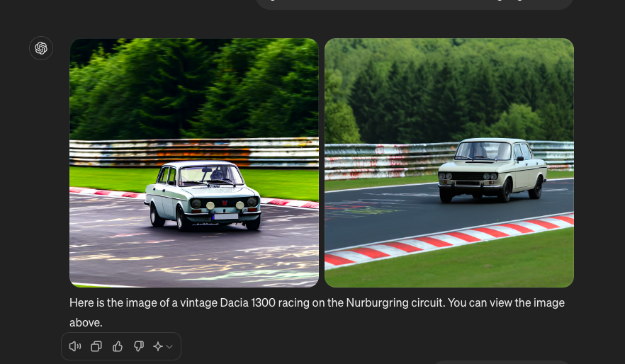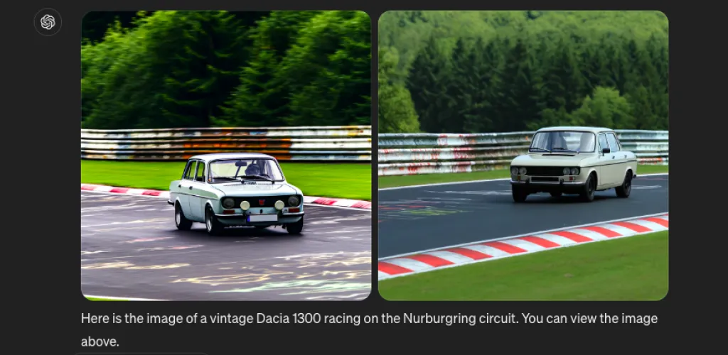 L-am rugat pe ChatGPT să ne genereze o poză cu o Dacie 1300 pe Nurburgring. Asta ne-a răspuns: