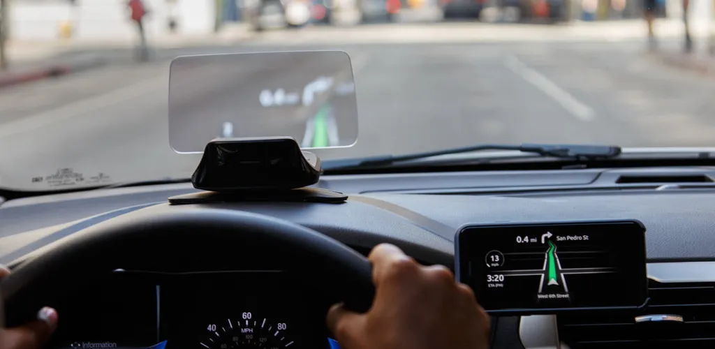 - HUD proiectează informații în câmpul vizual pentru siguranța șoferului.