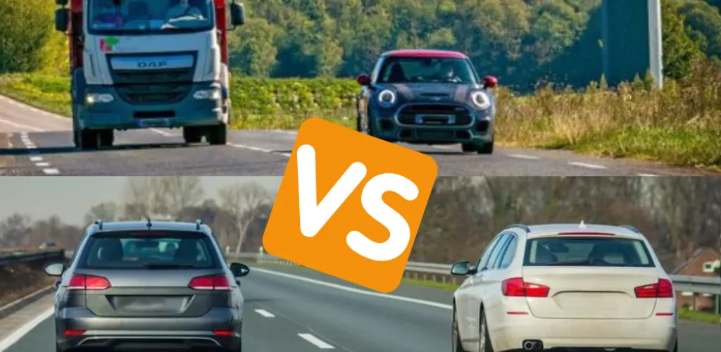 Un autoturism care circulă pe banda din dreapta a unui drum cu două benzi pe sens schimbă banda pentru a trece în fața unui camion lent, apoi revine pe banda inițială. Aceasta este o depășire.