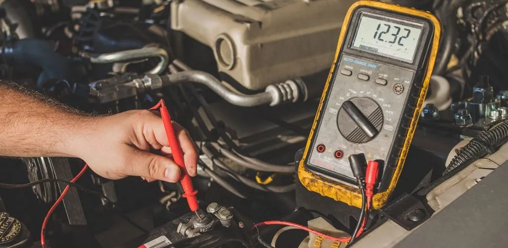 Before testing the alternator, we must verify the battery’s state. With the engine off and all electrical loads disconnected, connect the voltmeter to the battery terminals (red at +, black at -).