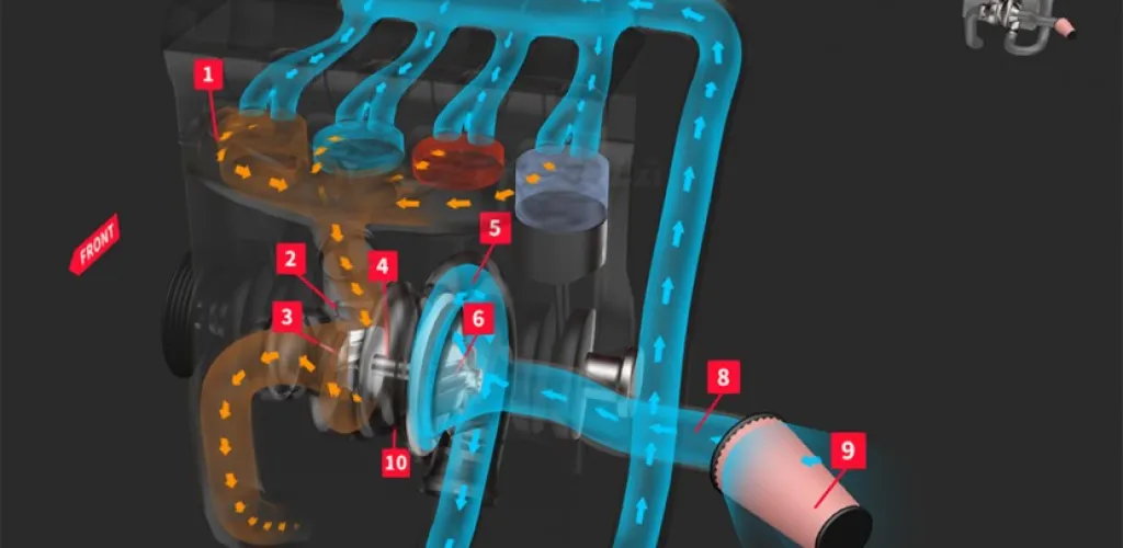 Exhaust gas flow: When the engine runs, pistons push exhaust gases through the exhaust valves. These gases, still very hot and pressurized, are directed toward the turbine rather than going straight to the exhaust pipe.