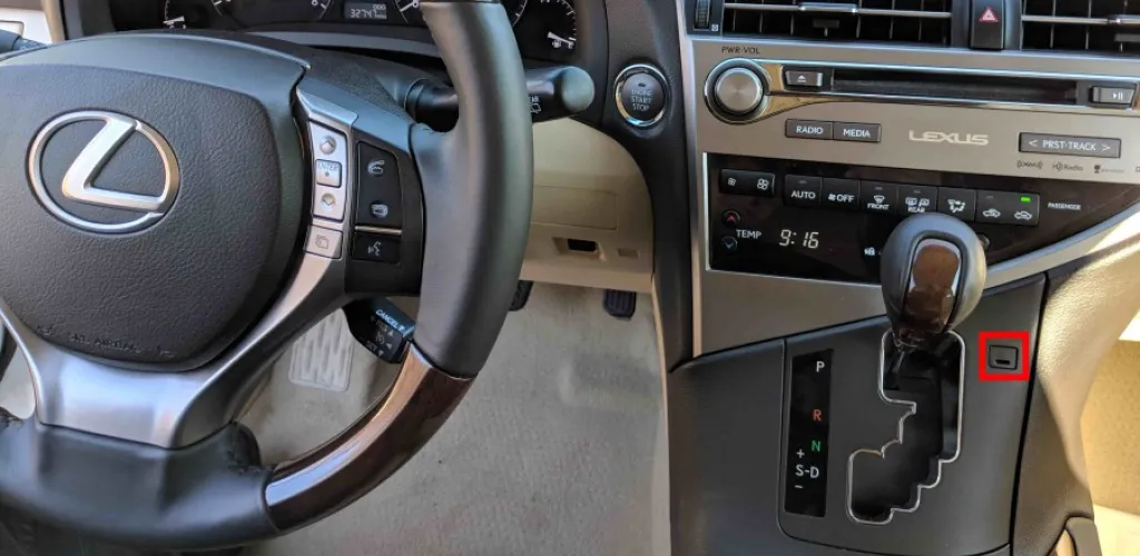 Examina atentamente la consola alrededor de la palanca de cambios. Busca una pequeña abertura, usualmente circular, con un diámetro de aproximadamente 5-8 mm, lo suficientemente grande para la punta de un destornillador plano.
