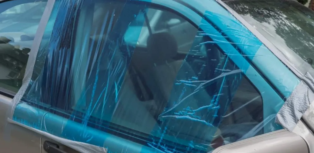 Enfin, après vous être assuré que le plastique est correctement fixé et couvre toute la surface de la vitre, il sera nécessaire de réaliser un périmètre autour de la vitre avec du ruban adhésif. Il est nécessaire de créer une étanchéité qui ne permette pas à l’air ou à l’eau de pénétrer à l’intérieur de l’automobile et qui protège la voiture. Selon le type de caoutchouc présent sur la partie inférieure de la vitre, s’il est plus souple et que le ruban de masquage n’adhère pas aussi bien que sur la partie supérieure, il peut être nécessaire d’utiliser une quantité plus importante de ruban adhésif.