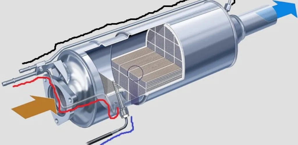 Le DPF est situé près du moteur et a une efficacité assez élevée. 85 % des suies provenant du moteur sont arrêtées et neutralisées par le DPF, et dans certains cas, jusqu’à 100 %. Pour maintenir le filtre à particules propre, le moteur initie un processus de régénération en injectant du carburant directement dans le système d’échappement. Ainsi, la température dans le DPF atteint 600 degrés Celsius, et les suies se transforment en cendres et sont éliminées du DPF, le nettoyant ainsi. Sur de nombreux véhicules, la régénération commence lorsque le PCM reçoit des informations du capteur de pression différentielle.