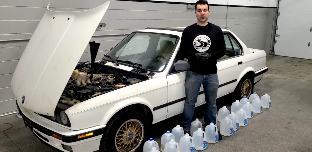 Le véhicule testé est une BMW 325i de 1989, de la série E30 avec 200 000 kilomètres au compteur. Le plan était de faire passer 80 litres d’eau à travers le moteur pour voir à quel point les pistons pouvaient être nettoyés. Cela fait suite à une expérience précédente, où seulement un demi-litre d’eau a été introduit lentement dans l’admission.