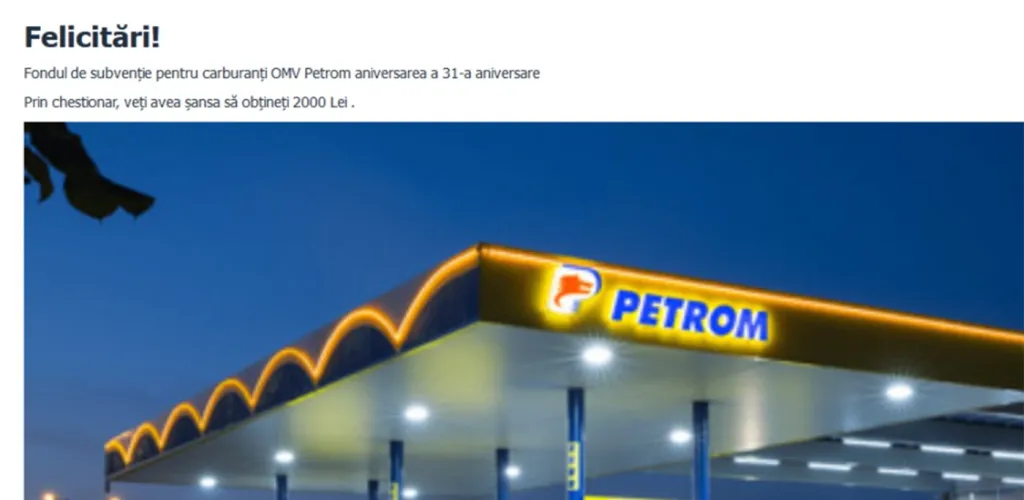 In ultima perioada, mai multe campanii false au fost lansate online in numele companiilor cunoscute. OMV Petrom este una dintre companiile in numele carora au fost trimise mesaje care promiteau castiguri de 2.000 de lei care puteau fi castigati prin deschiderea unui link si completarea unui chestionar online.