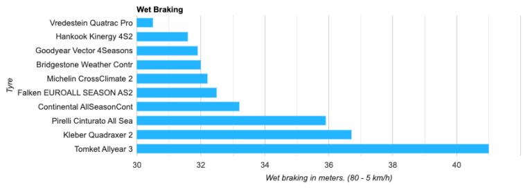 In vetta figurano Hankook Kinergy 4S2, Continental AllSeasonContact e Goodyear Vector 4Season Gen-3, ma la vincitrice chiara è Bridgestone WeatherControl A005 Evo, a confermare la reputazione del marchio sul fondo asciutto.