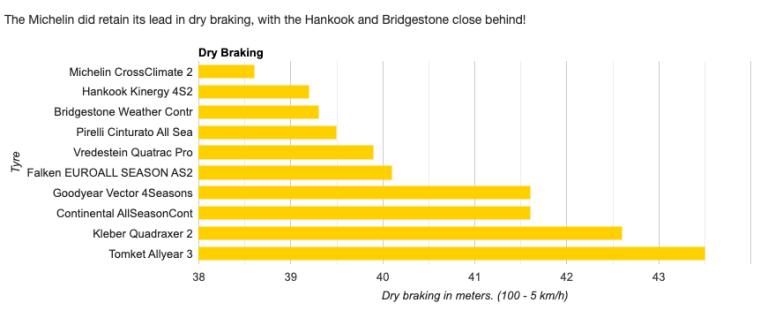 Test su terreno asciutto hanno mostrato che tutte le gomme hanno offerto prestazioni accettabili, anche i modelli di budget. La grande sorpresa negativa è stata la Quatrac Pro di Vredestein, che dimostra la difficoltà di eccellere simultaneamente su terreno asciutto e bagnato.