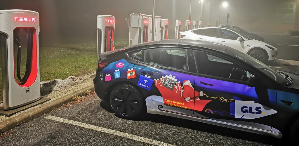 După reparație am oprit pentru prima dată la un supercharger Tesla. Am încărcat mașina până la 80% știind că avem stație de încărcare Eldrive în Turda. În acest timp, am mâncat rapid, și am “adus la viață” și cei doi călători clandestini, pe George și Ory care de data asta nu ne-au putut însoți fizic.