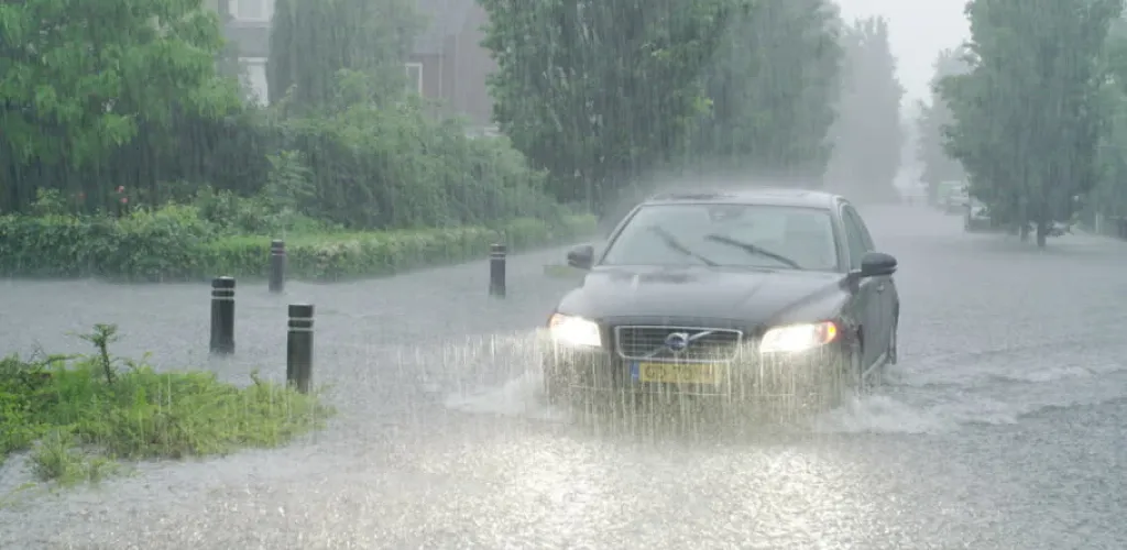 - Włącz światła awaryjne i utrzymuj widoczność podczas przejazdu przez zalaną strefę