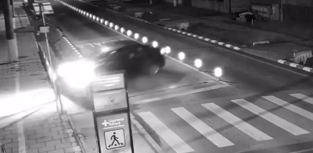 În clipurile distribuite pe platformele de socializare se poate observa cum un automobil de tip Logan se apropie cu viteză, iar șoferul pare să piardă controlul volanului în momentul în care ajunge în apropierea senzorilor limitatorului inteligent. Mașina intră pe contrasens, încearcă să își redreseze traseul, dar derapează, se rotește și lovește din lateral stâlpul pe care este montat semnul de trecere de pietoni.